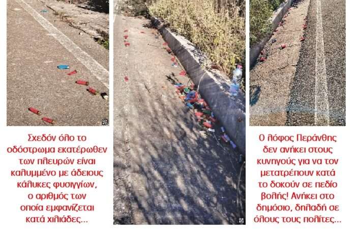Ο λόφος Περάνθης δεν τούς ανήκει για να τον μετατρέπουν κατά το δοκούν σε πεδίο βολής! Ανήκει στο δημόσιο και επομένως δικαιώματα έχουν όλοι οι πολίτες. Και αυτοί που πηγαίνουν να κάνουν τη βόλτα τους για να απολαύσουν την εκπληκτική θέα και οι περιπατητές, και οι αθλητές για τους οποίους αποτελεί ιδανικό μέρος προπονήσεων, και ο Σύλλογος Δρομέων που σε κάθε ευκαιρία αναδεικ- νύει την περιοχή, και ο Ορειβατικός Σύλλογος που με ανακοινώσεις του δεν παραλείπει να κάνει εκκλήσεις για σεβασμό και προστασία του περιβάλλοντος, αλλά – γιατί όχι – και οι εποχούμενοι είτε ποδηλάτων είτε αυτοκινήτων που σίγουρα δεν αισθάνονται όμορφα μ’ αυτό το οικτρό θέαμα που βλέπουν, το οποίο μόνο οργισμένες αντιδράσεις προκαλεί.