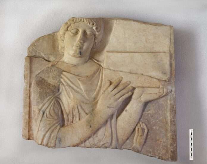 - Τμήμα μαρμάρινης επιτύμβιας στήλης, ύψους 0,55μ. και πλάτους 0,60μ. Εικονίζεται σε επίπεδο ανάγλυφο μετωπική γυναικεία μορφή, η οποία κρατά και με τα δύο της χέρια κοσμηματοθήκη με ανοιχτό κάλυμμα. Χαμηλότερα στην παράσταση σώζεται το δεξί χέρι μικρότερης σε κλίμακα μορφής, αναμφίβολα παιδικής. Πρόκειται για έργο επαρχιακού εργαστηρίου, πιθανότατα θεσσαλικού. Χρονολογείται στις αρχές του 4ου αι. π.Χ.