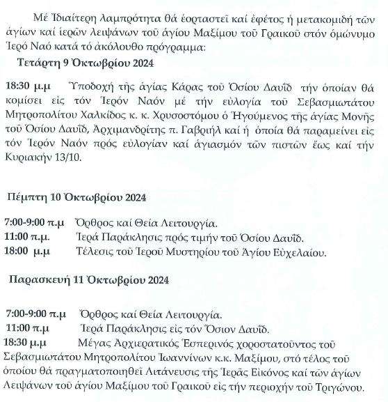 Πρόγραμμα Ιεράς Πανήγυρης Κατάθεσης Ιερού Λειψάνου Αγίου Μαξίμου του Γραικού στην Άρτα