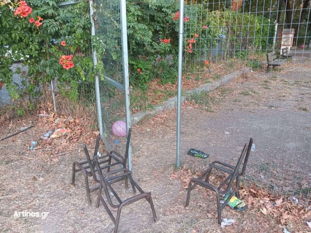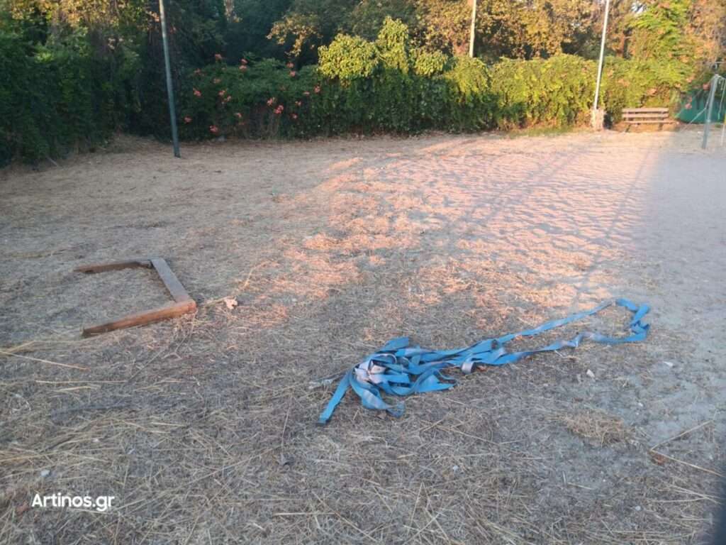 Τα παγκάκια σπασμένα και ξυλομένα, με πρόκες να εξέχουν επικίνδυνα. Το γήπεδο του βόλεϊ, καταστραμμένο, βυθισμένο στα σκουπίδια, παρατημένο στη μοίρα του. Παιδιά παίζουν σε χώρο που θυμίζει εγκατάλειψη – όχι γιατί δεν υπάρχουν εναλλακτικές, αλλά γιατί οι υποσχέσεις για «σύγχρονες παιδικές χαρές» έμειναν στα λόγια.