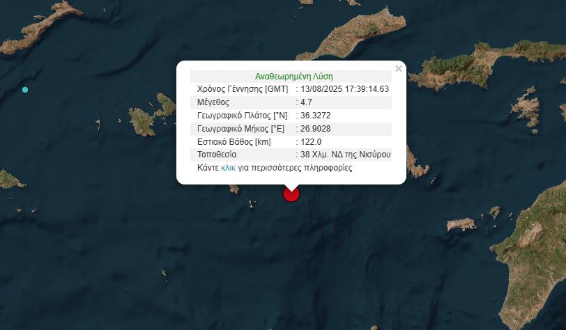 Σεισμός 4,7 Ρίχτερ σημειώθηκε στις 20:39 σε θαλάσσια περιοχή ανοιχτά της Νισύρου.