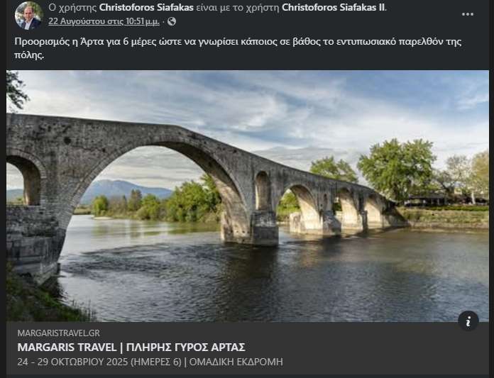 Στο προφίλ του στο Facebook, ο Δήμαρχος έκανε ανάρτηση διαφημίζοντας ταξιδιωτικό γραφείο που διοργανώνει εκδρομές στην Άρτα, γράφοντας χαρακτηριστικά: