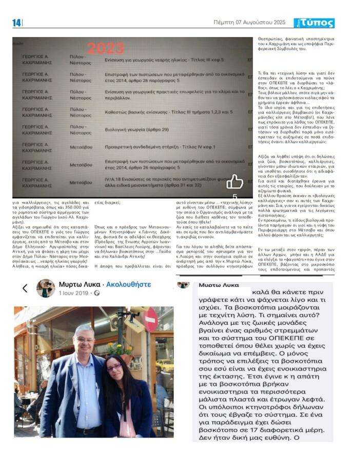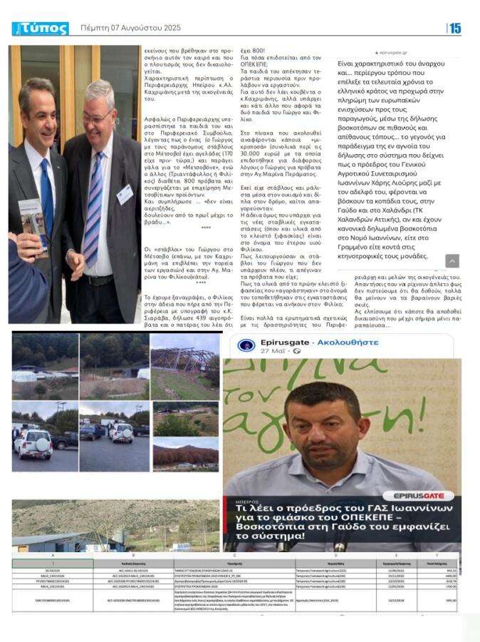 Αξίζει να σημειωθεί ότι στις καταστάσεις του ΟΠΕΚΕΠΕ ο γιός του Γιώργος εμφανίζεται να επιδοτείται για καλλιέργειες, εκτός από το Μέτσοβο και στον Δήμο Ελληνικού- Αργυρούπολης στην Αττική, για να φτάσει η χάρη του μέχρι στον Δήμο Πύλου- Νέστορος στην Μεσσηνίακαι ως …νεαρής ηλικίας γεωργός! Αλήθεια, η «νεαρή ηλικία» πόσες δεκαετίες διαρκεί; Όπως και ο πρόεδρος των Μετακινουμένων Κτηνοτρόφων κ.Γιάννης Δεκόλης, φυσικά δε οι αδελφοί κκ.Θεοχάρης (Πρόεδρος της Ενωσης Αγροτών Ιωαννίνων) και Βασίλειος Λιούρης, φέρονται να δήλωναν βοσκοτόπους στην …Γαύδο και στο Χαλάνδρι Αττικής!