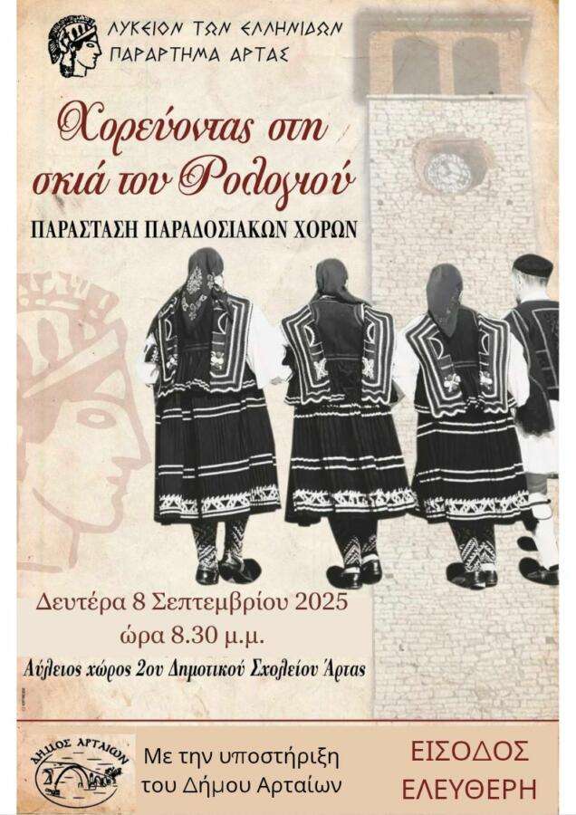 Το Λύκειον των Ελληνίδων Άρτας σας προσκαλεί στην παράσταση παραδοσιακών χορών, με τίτλο “Χορεύοντας στη σκιά του Ρολογιού”, που θα πραγματοποιηθεί στον αύλειο χώρο του 2ου Δημοτικού Σχολείου Άρτας, τη Δευτέρα 8 Σεπτεμβρίου 2025 και ώρα 8.30 μ.μ.
