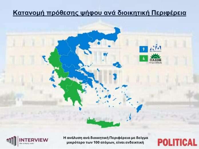Μια πολιτική έκπληξη πρώτου μεγέθους φέρνει η νέα πανελλαδική δημοσκόπηση της Interview για το Political, που δείχνει σημαντικές μετατοπίσεις στους πολιτικούς συσχετισμούς ανά την Ελλάδα. Το ΠΑΣΟΚ όχι μόνο ανεβαίνει, αλλά προσπερνά τη Νέα Δημοκρατία σε τέσσερις περιφέρειες της χώρας, ανάμεσά τους και η Ήπειρος, όπου το «πράσινο κύμα» φαίνεται να αποκτά νέα δυναμική.