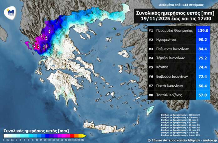Σύμφωνα με το δίκτυο αυτόματων μετεωρολογικών σταθμών του meteo.gr / Εθνικού Αστεροσκοπείου Αθηνών, το μεγαλύτερο ύψος αθροιστικού υετού έως τις 17:00 σημειώθηκε στην Παραμυθιά Θεσπρωτίας, φτάνοντας τα 139 χιλιοστά – δηλαδή περίπου 140 τόνους νερού ανά στρέμμα. Σημαντικές ποσότητες βροχής καταγράφηκαν και σε άλλες περιοχές της Ηπείρου και στην Κέρκυρα.
