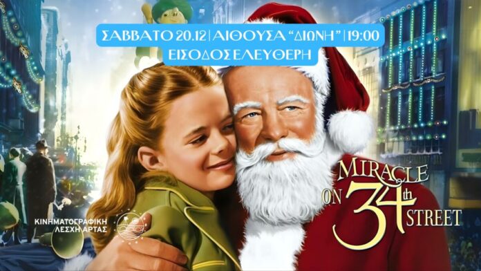 Η μαγεία των γιορτών συναντά τη νοσταλγία του κλασικού κινηματογράφου το Σάββατο 20 Δεκεμβρίου 2025 στην Άρτα, σε μια εκδήλωση που υπόσχεται να ζεστάνει τις καρδιές των θεατών. Η Κινηματογραφική Λέσχη Άρτας προσκαλεί το κοινό στην Αίθουσα Διώνη στις 19:00, για την προβολή μιας από τις πιο εμβληματικές ταινίες όλων των εποχών, το «Θαύμα της 34ης Οδού» (1947). Η επιλογή της συγκεκριμένης ταινίας δεν είναι τυχαία, καθώς αποτελεί έναν ύμνο στην αθωότητα και την ελπίδα, συνδυάζοντας το τρυφερό χιούμορ με τα βαθύτερα νοήματα των Χριστουγέννων. Με ελεύθερη είσοδο για όλους, η βραδιά αποτελεί την ιδανική ευκαιρία για μια εορταστική έξοδο που μας υπενθυμίζει την αξία της καλοσύνης.