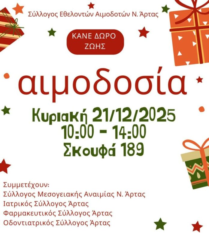 Μια ξεχωριστή πρόσκληση ανθρωπιάς και κοινωνικής αλληλεγγύης απευθύνει ο Σύλλογος Εθελοντών Αιμοδοτών Ν. Άρτας, ενόψει της εορταστικής περιόδου, καλώντας τους πολίτες να προσφέρουν το πιο πολύτιμο δώρο σε όσους το έχουν ανάγκη. Την Κυριακή 21 Δεκεμβρίου 2025, η Άρτα στέλνει ένα ηχηρό μήνυμα αγάπης, καθώς διοργανώνεται η τελευταία εθελοντική αιμοδοσία του έτους.