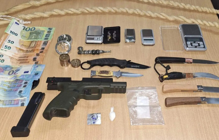 Κατασχέθηκαν πιστόλι (replica) με γεμιστήρα, 6 μαχαίρια, 4 γραμμάρια κοκαΐνης, 4 ζυγαριές ακριβείας κ.α.