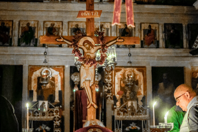 «Σήμερον κρεμάται επί ξύλου ο εν ύδασι την γην κρεμάσας», ψάλλει ο ιερέας την ώρα που περιφέρει τον εσταυρωμένο Ιησού στο ναό για την αναπαράσταση της σταύρωσης.
