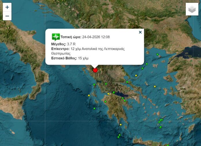 Σεισμική δόνηση μεγέθους 3,7 βαθμών της κλίμακας Ρίχτερ σημειώθηκε το μεσημέρι της Παρασκευής 24 Απριλίου 2026 στην Ήπειρο, προκαλώντας αναστάτωση στους κατοίκους της Θεσπρωτίας και των Ιωαννίνων. Όπως σημειώνει το artinos.gr, ο σεισμός σημειώθηκε στις 12:08, με το επίκεντρο να εντοπίζεται 8 χιλιόμετρα βορειοανατολικά της Λεπτοκαριάς Θεσπρωτίας, κοντά στον Τσαμαντά. Παρά το γεγονός ότι πρόκειται για μια δόνηση μεσαίας έντασης, έγινε ιδιαίτερα αισθητή στην ευρύτερη περιοχή λόγω του επιφανειακού χαρακτήρα της, με το εστιακό βάθος να υπολογίζεται στα 10 χιλιόμετρα.