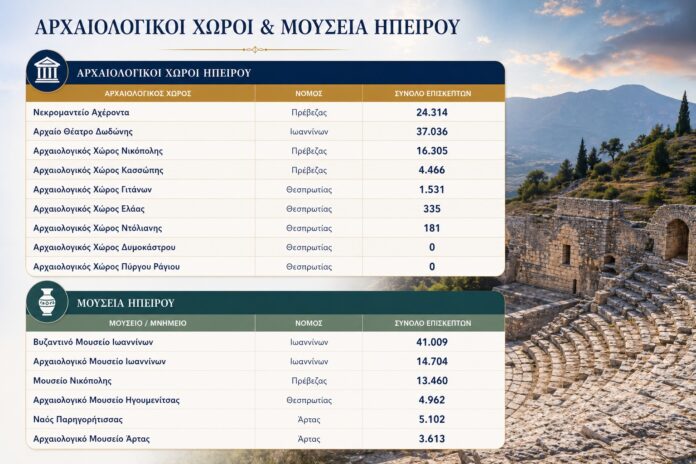 Στο επίκεντρο του προβληματισμού βρίσκεται η Δωδώνη, η οποία με 37.036 επισκέπτες δείχνει να αδυνατεί να ακολουθήσει την τουριστική άνοδο της υπόλοιπης χώρας. Αντίστοιχα, στην Πρέβεζα, η Νικόπολη με 16.305 επισκέπτες και το Νεκρομαντείο με 24.314 αποτελούν τους κύριους πόλους, όμως τα νούμερα απέχουν πολύ από το να χαρακτηριστούν ικανοποιητικά για το μέγεθος της επένδυσης. Στην Άρτα, ο Ναός της Παρηγορήτισσας με 5.102 επισκέπτες και το Αρχαιολογικό Μουσείο με 3.613, παραμένουν σε πολύ χαμηλά επίπεδα, αναδεικνύοντας την ανάγκη για καλύτερη τουριστική διασύνδεση.
